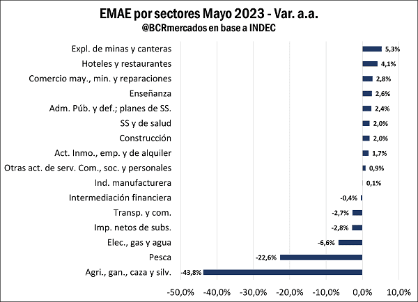 Este resultado es explicado principalmente por la dramática caída en el sector de Agricultura, Ganadería, Caza y Silvicultura cuya disminución fue del 43,8% con relación al mes de mayo del año anterior que, con una ponderación del 8,1% en el índice, explica aproximadamente el 3,5 p.p. de la caída total. Esto se debe principalmente a la caída en la producción de cereales y oleaginosas causadas por la grave sequía de este año, algo que no ocurría desde la campaña 88/89. Pesca y Electricidad, Gas y Agua fueron los otros dos sectores que contribuyeron en mayor medida a la caída (22,6% y 6,6%, respectivamente), mientras que Explotación de Minas y Canteras en conjunto con Hoteles y Restaurantes lideraron los incrementos (5,3% y 4,1%, respectivamente).