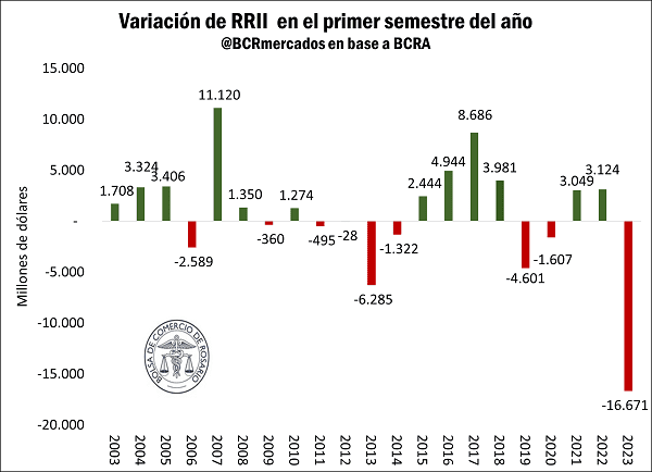 Como mencionáramos en esta nota, el porvenir de la economía Argentina en el corto plazo está ligado estrechamente a la disponibilidad de divisas, de tal forma que el costo de mantener la actividad económica, la administración del tipo de cambio y el repago de deuda a organismos internacionales en los primeros seis meses del año fue de más de u$s 16.600 millones de reservas internacionales, un guarismo de tal magnitud nunca se había registrado en los últimos veinte años.