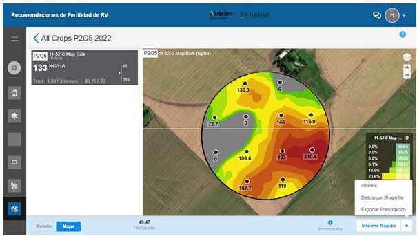 En cuanto a la utilización de las recomendaciones destacó que: “una de ellas es por ambiente donde se puede analizar cada objetivo de rinde, el dato del suelo y el dato de cálculo que voy a utilizar para llevarlo a cabo y llegar a tres dosis. Ahora bien, si partí del muestreo en grilla que era más costoso pero me generaba mucha más información, puedo pensar en llevar el nivel de fósforo a 20 partes por millón (ppm) o a 18 ppm y la plataforma me va a permitir, mediante un cálculo automático, llegar a esa prescripción con mayor detalle donde por ejemplo le solicitaré que me aplique no menos de 30 kilos de fertilizante y después me eleve el lote a 18 ppm de fósforo y también luego puedo pensar en incorporar un mapa de rendimiento de un cultivo previo, y de esta manera sumar una porción que corresponde a la remoción hecha por el mismo”.
