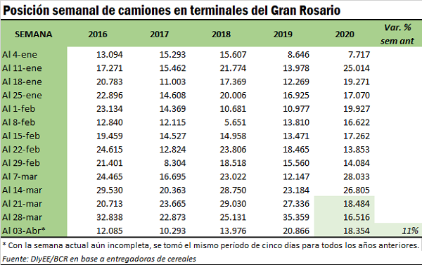 Puede observarse en el cuadro que sigue que en la semana que coincide con el inicio del aislamiento social preventivo y obligatorio dispuesto por el Gobierno Nacional se observó una baja concomitante en el ingreso de camiones para descarga de granos en las terminales portuarias de la zona del Gran Rosario, aunque en esta última semana la situación da señales de comenzar a normalizarse. Con más de 18.300 camiones reportados entre las 00:00 y las 06:00 entre el lunes y el viernes, el número resulta un 11% superior al ingreso de los 7 días anteriores y, si bien se encuentran por debajo del año pasado, es más alto que en los tres años previos, incluso a pesar que algunas lluvias en la semana podrían haber demorado las labores de cosecha en las localidades afectadas.