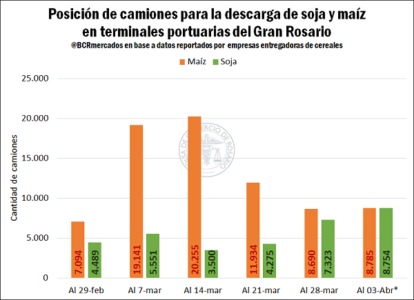 Puede observarse, además, que conforme comienza a generalizarse la trilla de soja privilegiándola por sobre el maíz, se nota un cambio en la composición de las cargas en favor de la oleaginosa, tal como muestra el gráfico adjunto.