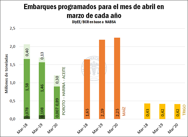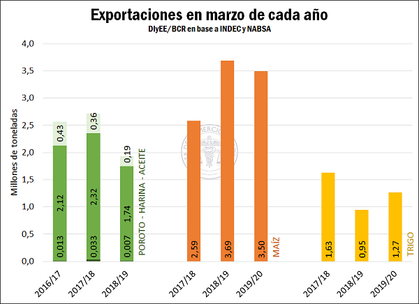 En relación a los embarques, pueden observarse en el primero de los gráficos que sigue que, según consta en la información de buques zarpados en marzo desde los puertos de todo el país, la carga en volumen tanto de los principales productos del complejo soja (poroto, harina y aceite) como de maíz se ubicó por detrás de los registros de exportación de marzo 2019, aunque en el segundo caso se trata aún del segundo mayor volumen en la historia argentina para este mes. El trigo, en tanto, registró embarques superiores al mismo mes del año anterior.