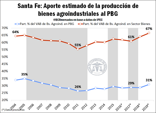 En total, el Sector Agroindustrial, concentró en 2019 el 31% del Producto Bruto que generó de Santa Fe; es decir, $3 de cada $10 pesos de Valor Agregado que generó la provincia, correspondió a la actividad de estas cadenas. Si nos focalizamos solamente en el sector productor de bienes, y excluimos a los servicios de esta consideración, vemos que el sector representó en dicho año el 67% del Valor Bruto de Producción del mismo, el valor más alto alcanzado en la serie analizada.