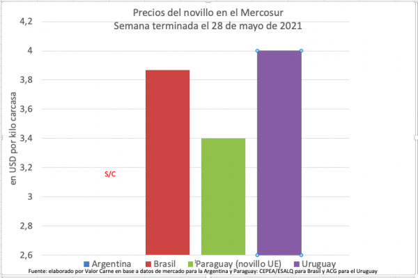 Paraguay: el novillo apto para UE está a USD3,40, cinco centavos más. Los negocios demandan volumen pero están con cotizaciones tranquilas.