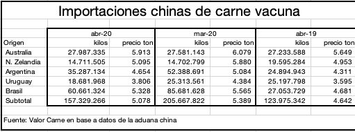 La Argentina fue el único país sudamericano en enviar carne enfriada sin hueso en abril a China, a un precio medio de USD 5.570, 30% menos que lo obtenido por Australia y 10% menos que Nueva Zelanda.