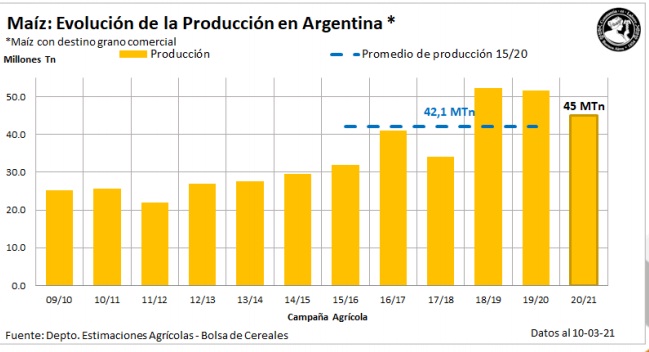 Luego de una semana con lluvias escasas en gran parte del área agrícola nacional, el estado de los cuadros de maíz con destino grano comercial comenzó a desmejorar. Esta baja en la condición del cultivo impacta sobre los rindes potenciales de parte de los lotes del cereal. Frente a este panorama, disminuimos nuestra estimación de producción en 1 MTn. La nueva proyección nacional para la campaña 2020/21 se ubica en 45.000.000 Tn, 6,5 MTn menos que el ciclo previo (Producción campaña 2019/20: 51,5 MTn). En paralelo, las labores de cosecha continuaron en el centro del país. A la fecha ya se logró recolectar el 3,4 % del área apta, luego de relevar un avance intersemanal de 1,5 puntos porcentuales.