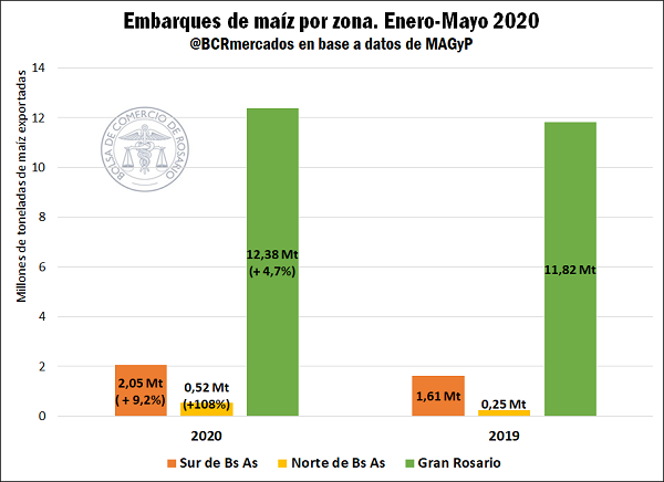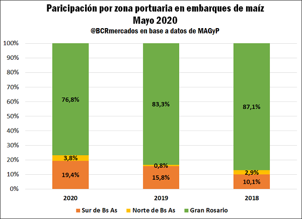 En el acumulado anual a mayo, con embarques de casi 15 Mt de maíz desde todos los puertos (un incremento de casi 10% en relación con el mismo período de 2019), se puede ver una tendencia similar, aunque más atenuada.