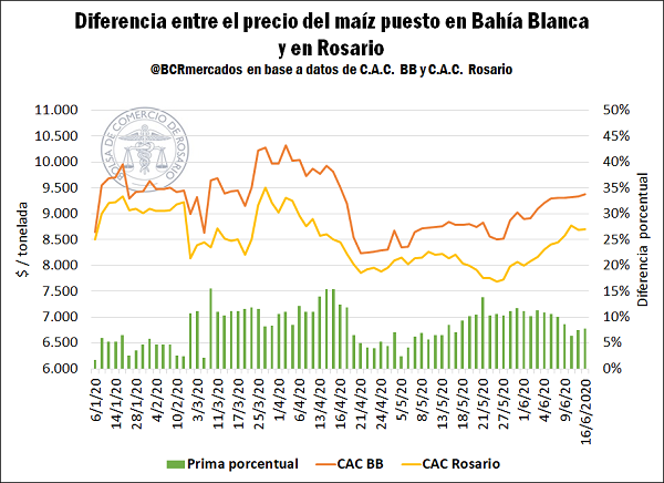 Esta necesidad de originar mercadería en el sur de Buenos Aires continúa generando una prima considerable entre el precio del maíz puesto en Bahía Blanca y el precio puesto en Rosario. Esta prima había experimentado picos marcados sobre mediados del mes de abril (con diferencias de hasta US$ 20/t), disminuyendo hacia finales de ese mes.