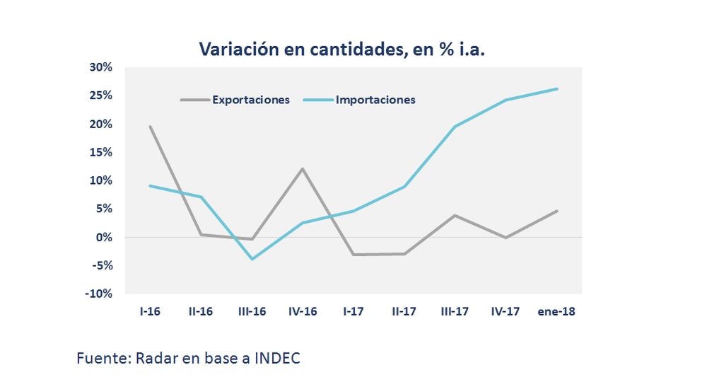 “El balance comercial de enero de 2018 refleja que el frente externo continúa con los mismos problemas que arrastró durante los últimos meses. El elevado dinamismo de las importaciones (+26,2% en cantidades) no es acompañado por el de las exportaciones (+4,6% en cantidades)”, evaluó la Consultora Radar en un informe.