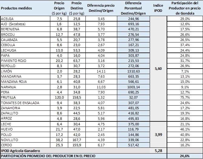 Así, la diferencia de Precio Origen-Destino indica la cantidad de veces que aumenta el precio del producto al comercializarse en góndola.