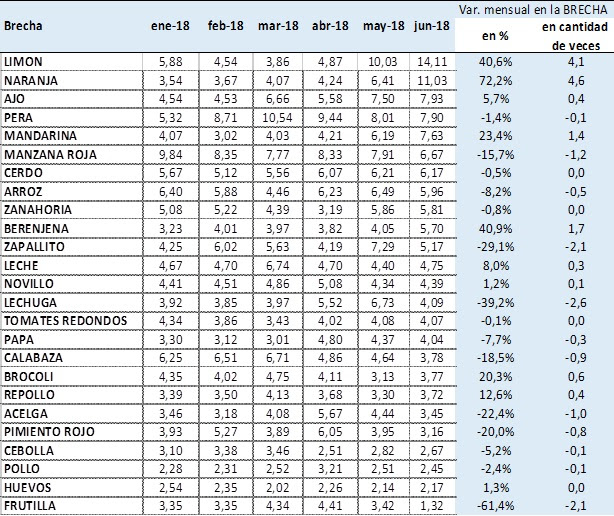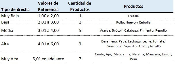 Sólo tres productos tuvieron brechas “bajas”: huevo, cebolla y pollo, que ya en mayo habían tenido valores muy similares. Por otra parte, cinco se mantuvieron con brechas ‘medias’, y uno, la frutilla, tuvo brecha “muy baja” (entre 1 y 2), siendo atípica tan poca diferencia en estos productos.