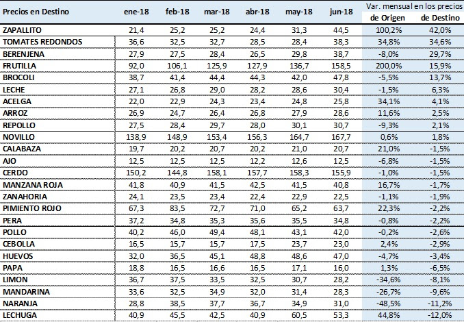 Para obtener los precios de origen, se consultaron telefónicamente a 10 productores de cada alimento localizados en las principales zonas productoras de cada uno de esos productos.