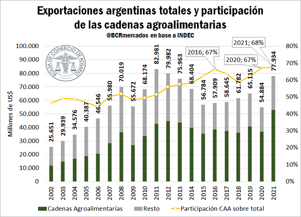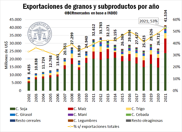 Haciendo foco exclusivamente en los granos y sus derivados de primera y segunda industrialización, éstos alcanzaron en conjunto exportaciones por US$ 41.534 millones durante el último año, el mayor registro de la historia. Además, representaron el 53% de las exportaciones argentinas del 2021, alcanzando también la mayor participación desde al menos el nuevo milenio.