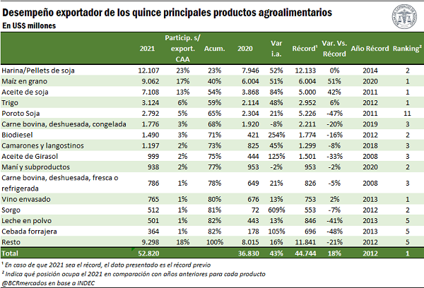En el cuadro que sigue se presentan los 15 principales productos exportados del sector agroalimentario del 2021, su desempeño con relación al año anterior y también en relación con el récord exportador para cada uno de los productos.