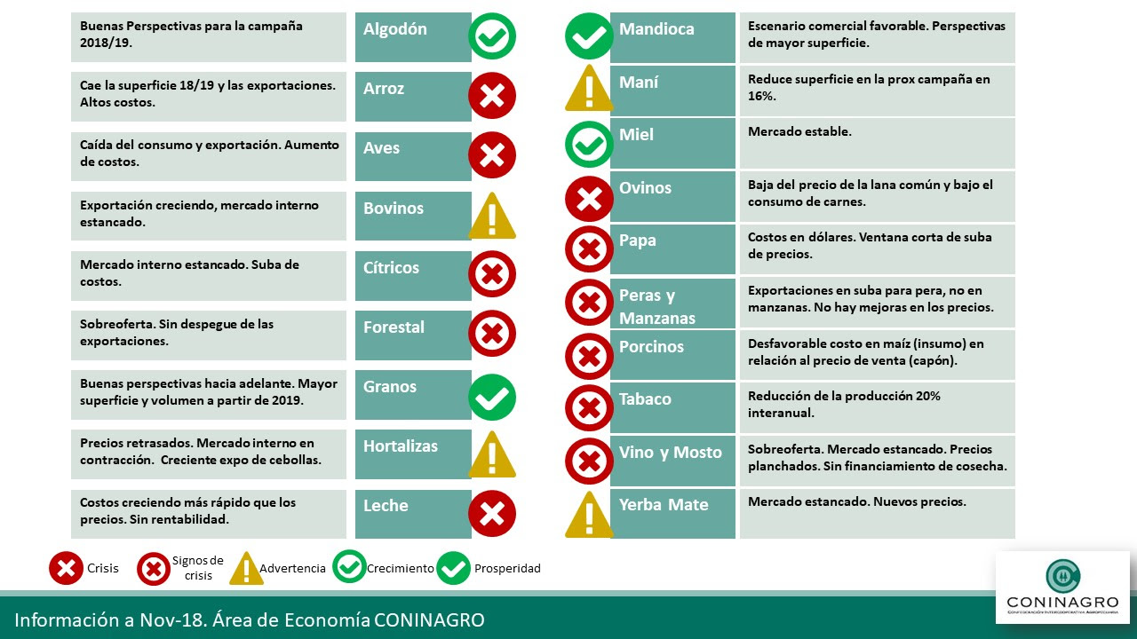 Se da a conocer el décimo semáforo que elaboramos en Coninagro. El análisis de cada actividad durante noviembre se resume en el cuadro que indica, en esta oportunidad, 11 producciones en rojo, 4 en amarillo, 4 en verde.