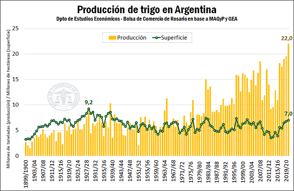 La extraordinaria performance del complejo trigo se sustenta en el avance de las siembras previstas para la nueva campaña 2020/21. Según proyecciones de GEA/BCR, ésta podría alcanzar a cubrir 7 millones de hectáreas, con un incremento interanual del 3%. De lograrse, se trataría de la mayor superficie sembrada desde la campaña 2001/02 cuando se implantaron 7,1 millones de hectáreas, aunque aún lejos del récord que supo alcanzar el cultivo a fines de la década de 1920, cuando bajo la presidencia de Marcelo T. de Alvear consiguió la marca de 9,2 millones de hectáreas.