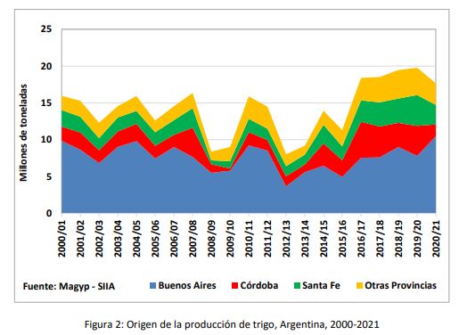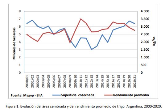 Esta suba de los precios internacionales se revierte en la campaña 2012/2013 provocando una disminución del 30% del área sembrada y consecuentemente de la producción. En este periodo se registra la superficie sembrada más baja de la historia (3,0 millones de hectáreas) que sumada a una fuerte sequía resultó en la cosecha más baja de los últimos 33 años (8,0 millones de toneladas). Durante la campaña 2016/17 el esquema de incentivos basado en la eliminación de derechos y restricciones a las exportaciones, impactaron de forma positiva en la producción de este cultivo observándose a lo largo del quinquenio un aumento progresivo del área sembrada y del volumen de producción que alcanza su máxima expresión en la campaña 2019/20 con 6,7 millones de hectáreas cosechadas y un record productivo de 19,8 millones de toneladas. En la campaña 2020/21, la producción triguera cayó un 10,7% (2,1 millones de toneladas) respecto de la campaña anterior como consecuencia de la sequía que por un lado limitó el área sembrada y por el otro disminuyo el rendimiento promedio por hectárea (Figura 1).