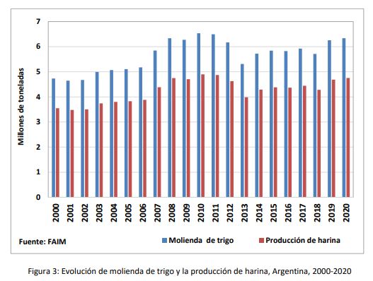Hasta el año 2006, la molienda de trigo promedio rondó los 4,9 millones de toneladas y la producción promedio de harina fue de 3,7 millones de toneladas. A partir de 2007 y hasta 2012 aumentó el trigo destinado al mercado interno (molienda promedio 6,3 millones de toneladas) y en consecuencia el nivel promedio de producción de harina se incrementó a 4,7 millones de toneladas. Durante el año 2013, la molienda de trigo registró un retroceso del orden del 14% como consecuencia de la abrupta caída en la producción del cereal. En el periodo comprendido entre 2014-2018 la molienda promedio se ubicó en torno a los 5,8 millones de toneladas y la producción de harina en 4,4 millones de toneladas. En los dos últimos años, se produce un incremento de la molienda y de la producción de harina del orden del 8,5% congruente con el aumento en la producción de trigo. Si bien, durante los años 2019 y 2020 no se alcanzaron los máximos registrados en el año 2010, la molienda y la producción de harina se ubicaron en el orden de los 6,3 y 4,7 millones de toneladas, respectivamente.