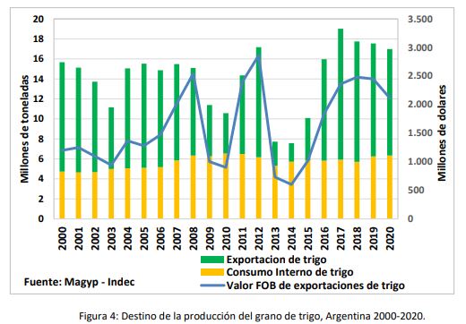 El trigo cosechado en la Argentina abastece, en primer término, la demanda de la industria molinera mientras que los excedentes se destinan al mercado externo. En los últimos veinte años el mercado interno se mantuvo relativamente estable ya que su crecimiento está íntimamente relacionado con el aumento de la población, observándose una tasa de variación levemente positiva. Por lo tanto, los saldos exportables de trigo como grano fluctúan anualmente en relación al nivel de producción, creciendo en los años de buena cosecha y contrayéndose en los ciclos adversos.