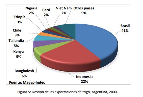 En 2020, el principal destino del grano de trigo fue Brasil, país que históricamente ha ocupado el primer lugar entre los cinco primeros países que absorben las exportaciones argentinas del cereal, con una participación en el volumen exportado del orden del 42%. Le sigue Indonesia con el 22%, Bangladesh con el 6%, Kenya con el 5%, Tailandia con el 5% (Figura 5). Analizando los últimos veinte años, se advierte que Chile, Bolivia, Perú, Egipto, Etiopia, Colombia y Sudáfrica, son también destinos frecuentes, pero año a año se ubican en diferentes posiciones. El mercado interno consume más del 85% de la producción de la harina de trigo, destinándose el excedente a la exportación. La industria de la panificación, absorbe casi el 70% de la harina destinada al mercado interno y abarca tanto la panificación artesanal como la industrial, siendo la primera la más significativa. El 30% restante se distribuye entre la industria de pastas frescas y secas, la de galletitas y bizcochos y como harina fraccionada para el consumidor final.