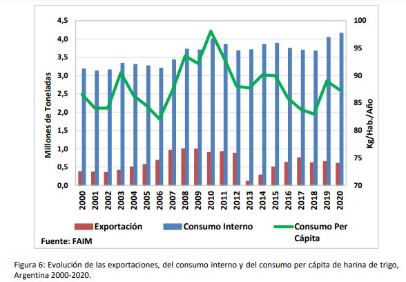 Entre 2000 y 2010 el consumo aparente de harina de trigo creció un 26%, mientras que el consume per cápita lo hizo en un 13%. Entre 2010 y 2020 el consumo interno aumentó solo un 4%, produciéndose una caída en el consumo per cápita del 11%. En los últimos veinte años, el consumo promedio anual de harina es de 88 kg/hab., registrándose un consumo mínimo de 82 kg/hab. en el año 2006 y un máximo de 98 Kg/hab. en el año 2010.