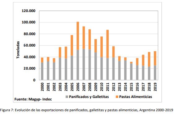 El consumo interno de pastas alimenticias secas y frescas se estimó para el año 2019 en 330 mil toneladas, alrededor de 7,5 kg/hab/año. Para ese mismo año las exportaciones realizadas fueron de 24,7 mil toneladas y por un valor 17,3 millones de dólares, ocupando el 26° y el 37°lugar en el ránking internacional por el volumen y el valor de las exportaciones de pastas secas. El principal destino fue Chile (31,4%), seguido de Paraguay (6,3%), y con menor participación Uruguay y Estados Unidos