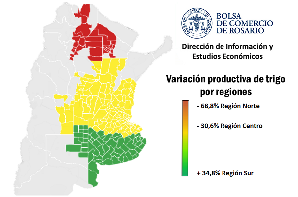 Según estimaciones propias, las mermas productivas serían percibidas en la región norte y la región centro, con pérdidas del 68,8% y del 30,6%, respectivamente, comparando con lo producido en la campaña 2019/20. Se estima que la región norte, que comprende el norte de Santiago del Estero y los territorios de Chaco, Salta, Tucumán y Catamarca, cosechará poco más de 260.000 toneladas, alrededor de 560.000 toneladas por debajo de lo obtenido la campaña anterior. Por otra parte, se estima que los trigales de la región centro (sur de Santiago del Estero, Santa Fe, Córdoba, Entre Ríos, San Luis y norte de Buenos Aires) originen 9,3 millones de toneladas, aproximadamente 4 millones de toneladas menos que en 2019/20.