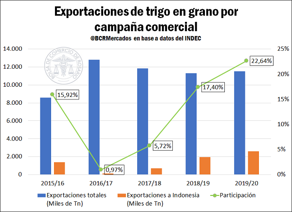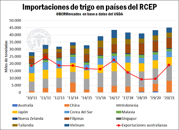 El mercado de Indonesia ha adquirido gran atractivo puesto que su gran población (es el cuarto país más poblado del mundo) se ha transformado en importante consumidora de cereal argentino en los últimos años. Las primeras exportaciones a dicho país se dieron a principios del 2016 y en la campaña 2020 se ha superado por primera vez las 2 millones de toneladas remitidas a este destino (teniendo en cuenta el total exportado entre diciembre del 2019 y septiembre del 2020). Este volumen representa hasta el momento el 22,64% de las exportaciones totales del país sólo para esta campaña, lo cual lo convierte en el segundo mayor importador de trigo argentino, siendo superado únicamente por Brasil. Finalmente, aunque representan participaciones menores a las citadas, se debe destacar que Argentina también abastece de trigo a Vietnam, Tailandia, Filipinas y Nueva Zelanda, con lo cual puede afirmarse que el RCEP representa una amenaza latente para las exportaciones del sector. A pesar de que las exportaciones de Australia no lleguen a satisfacer el total de la demanda de los países que firmaron el tratado, la relocalización de exportaciones conlleva dificultades intrínsecas del comercio internacional, como la apertura inicial del mercado y la aceptación generalizada de los productos importados.