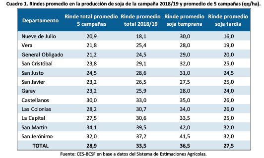 qq/ha, superando a los valores del año pasado en un 30,4% (8,5 qq/ha más), mientras que para las variedades de soja tardía el rinde promedio se ubicó en 27,5 qq/ha, un 66,7% más que el ciclo 2017/18.