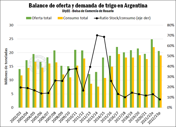 El ciclo 2021/22 viene mostrando valores récords en muchos indicadores del trigo. Por una parte, el máximo productivo de más de 23 millones de toneladas permitió tener la mayor oferta total de trigo de la historia. Al mismo tiempo, el volumen exportado ya es el más alto del que se tenga registro, esperando llegar a las 14,5 Mt de cara al fin de la campaña. No conforme con ello, el nivel de consumo interno de trigo creció más de un 5% respecto al promedio de consumo de la última década.