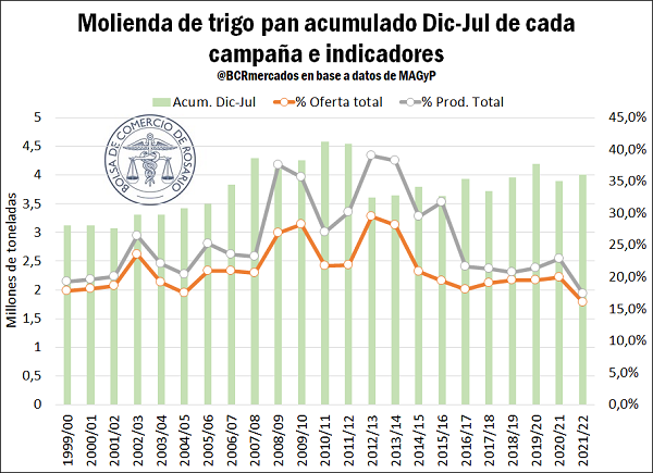 En cuanto a la evolución de la molienda de trigo pan en la campaña 2021/22, si comparamos lo sucedido en los primeros 8 meses de campaña, de diciembre a julio de cada ciclo, vemos que los niveles de procesamiento del trigo son superiores a los mostrados en la campaña anterior. En este sentido, la molienda creció un 3% y se posiciona rompiendo el techo de 4 Mt por segunda vez en diez años en lo que va de la campaña. No obstante, la producción creció por encima de la molienda, lo que lleva tanto a las relaciones Molienda/Oferta, así como Molienda/Producción, a caídas en sus valores relativos.
