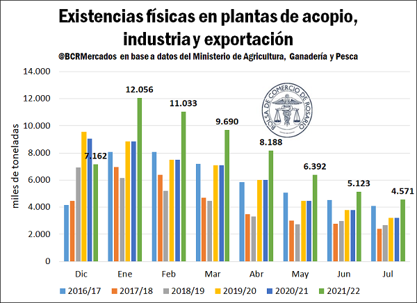 Respecto a las existencias físicas de granos en plantas de acopio, industria y exportación, teniendo en cuenta la comparativa en las últimas 5 campañas, para el período diciembre- julio de cada ciclo, debido al récord de la campaña 2021/22, las existencias de trigo suman a julio del corriente año las 4,5 Mt, el máximo valor respecto de las últimas campañas y un 42% por encima del valor del ciclo pasado, explicado fundamentalmente por la cosecha récord del trigo argentino.