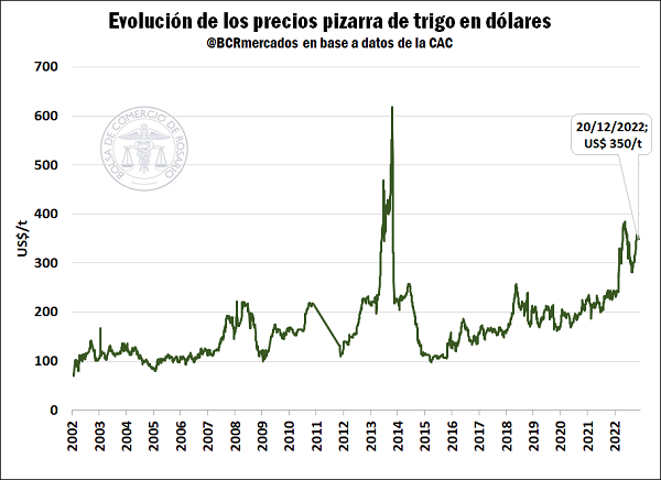 Al 20/12 del año que corre, las cotizaciones se ubican en torno a los US$ 350/t, un máximo en 10 años, señalando la prima del mercado ante la limitada oferta de trigo y potenciados por un débil equilibrio global en la hoja de balance de trigo.