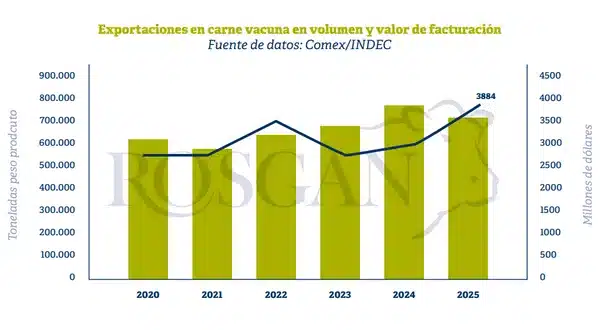 Durante el año se exportaron 713.364 toneladas peso producto, lo que implicó una caída interanual del 7,2%. Sin embargo, los ingresos generados ascendieron a US$ 3.884 millones, un 28,5% más que en 2024, marcando el mayor nivel histórico de dólares para la cadena cárnica