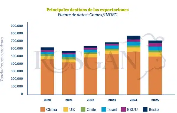 Uno de los cambios más relevantes fue el reposicionamiento de los destinos. China, que históricamente concentraba casi tres cuartas partes de las exportaciones, redujo su participación del 74% al 70%. En términos absolutos, los envíos pasaron de 569 mil toneladas en 2024 a 498 mil en 2025, con un valor promedio de US$ 3.800 por tonelada.