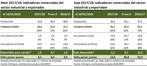 A causa de lo anterior, se han sucedido los recortes en las estimaciones de producción de soja. En enero, la CONAB bajó la cosecha proyectada de soja 2018/19 de 120,1 a 118,8 Mt, desvaneciendo las esperanzas de alcanzar la mayor producción de la historia brasileña en la nueva campaña, a pesar del área sembrada récord de 36 millones de hectáreas. Esta previsión, de todos modos, resulta aún superior de lo estimado por agencias privadas como INTL FCStone (116,25 Mt), AgRural (116,9 Mt) y Agroconsult (117,6 Mt).