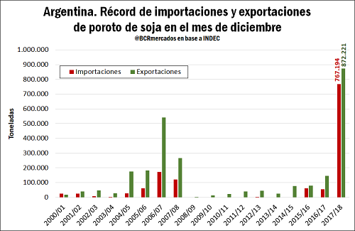 Con envíos por 872.000 toneladas, las exportaciones argentinas de poroto de soja en el mes de diciembre alcanzaron un récord histórico en el contexto de una guerra comercial entre China, principal comprador mundial de la oleaginosa y Estados Unidos, su abastecedor líder. Simultáneamente, las compras al exterior de poroto sumaron 767.000 toneladas en el mes, el mayor volumen en la historia para este período. De este total, el 85% de la mercadería provino de Estados Unidos. Las necesidades de mercadería que ha tenido el complejo oleaginoso local en esta campaña 2017/2018 fueron evidentes ante los efectos de la peor sequía que ha sufrido Argentina en los últimos 50 años.