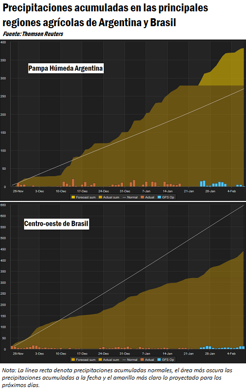 En Argentina, en tanto, las abundantes y prolongadas lluvias generalizadas que se intensificaron durante las últimas semanas en la región noreste del país, causó daños a la producción agrícola nacional. De acuerdo a Reuters, el 18 de enero los acumulados promedio en la región pampeana superaban en más de 85 mm a los niveles normales de lluvia y se prevé que a fin de enero esta brecha aumente, posicionándose 100 mm por encima de la media de la región. Los valores para dos de las provincias más afectadas por los temporales, como Santa y Entre Ríos donde se dieron importantes desbordes de ríos y arroyos, son aún más abultados. Al 18 de enero, el promedio de las lluvias registradas en la provincia de Santa Fe era de 407,9 mm, superando por 162,5 mm al valor promedio normal de 245,4 mm. Se estima que a fin de mes las precipitaciones superen a la media provincial en 146,1 mm. En la provincia vecina de Entre Ríos el promedio de lluvias acumuladas al 18 de enero superó en 276 mm a la media, más que duplicando los valores de lluvia normales para la época. Al 31 de enero se prevé que el acumulado siga superando en 254 mm a la media.