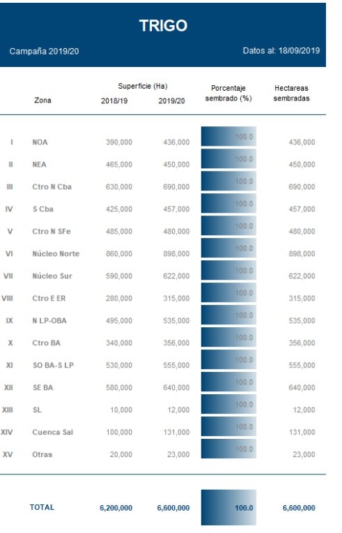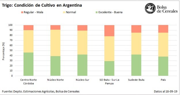 Por otro lado, la franja central del país se encuentra entre macollaje y espigazón, con buenos niveles de humedad, lo que obliga a realizar frecuentes controles contra enfermedades para mantener más del 80 % de los cuadros en condición de buena a excelente. Finalmente, al sur del área agrícola el cultivo presenta una demora en la encañazón de entre 10 y 20 puntos porcentuales respecto al promedio de las últimas 5 campañas. Entre el 20 y 35 % del área presenta una condición de humedad de regular a sequía, además de haber sufrido bajas temperaturas, afectando el crecimiento y desarrollo de las plantas y poniendo en riesgo la generación del rendimiento.
