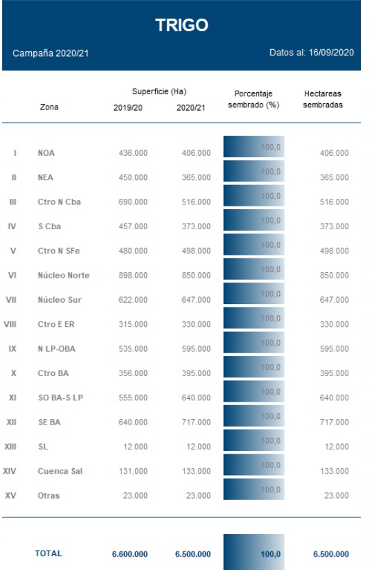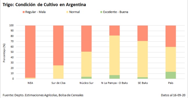 Tras una nueva semana sin precipitaciones la condición del cultivo de normal a excelente cae 3 puntos porcentuales. En el norte del país, ya próximos a iniciar la recolección de los primeros cuadros implantados, las expectativas de cosecha tras la sequía y las heladas son bajas. En el centro del área agrícola, los sectores que hace dos semanas recibieron lluvias mantienen su condición, sin embargo, los que no fueron alcanzados por el frente de tormenta se encuentran más comprometidos. Finalmente, en las provincias de Buenos Aires y La Pampa, la condición del cereal es variable, en función de las precipitaciones y las heladas, y están a la espera de nuevas lluvias para emparejarse.