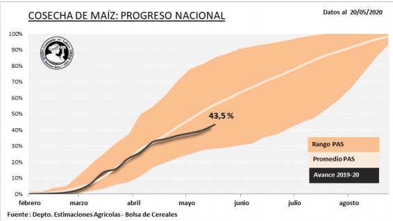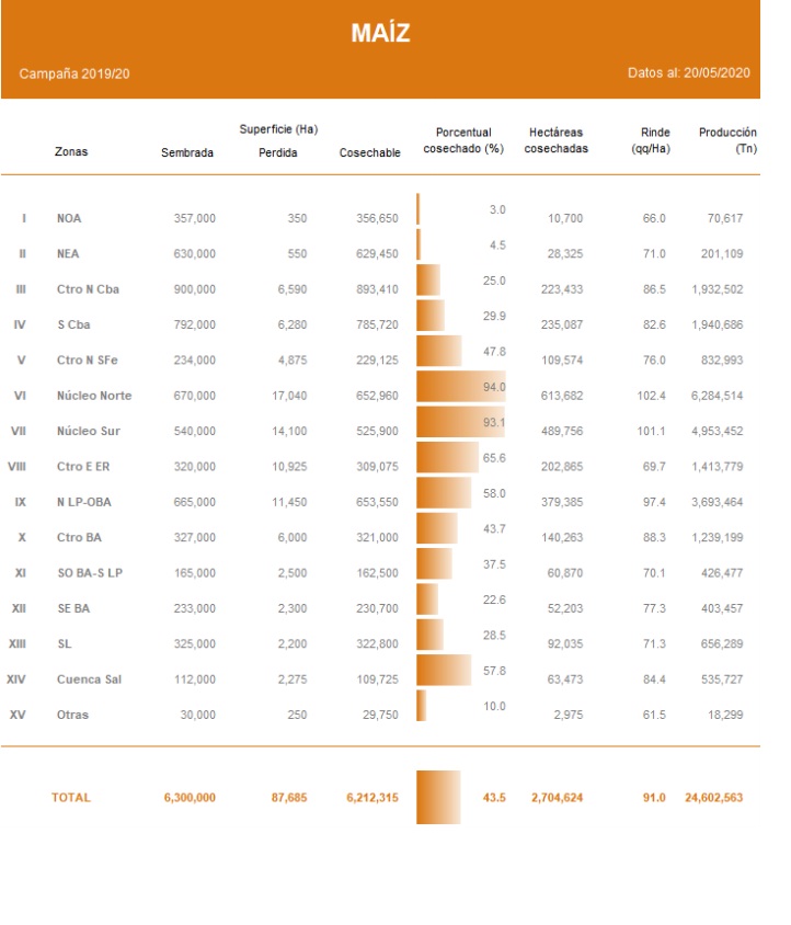 El progreso de recolección de maíz con destino grano comercial se ubica en el 43,5 % del área apta, luego de relevar un progreso intersemanal de 3,5 puntos porcentuales. La cosecha de cuadros tardíos y de segunda ocupación entrega buenos rendimientos en las provincias de Córdoba y Santa Fe. Por otro lado, continua la recolección de planteos tempranos en el norte y sur del área agrícola nacional. El rinde medio nacional a la fecha se ubica en 91 qq/Ha, luego de cosecharse más de 2,7 MHa. Bajo este escenario, mantenemos la proyección de producción en 50 MTn
