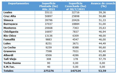 El Laboratorio de Sistemas de Información Territorial del INTA Famaillá determinó, a partir del procesamiento de imágenes satelitales, un avance cercano al 54% en la cosecha del cultivo en la provincia. El dato equivale a 147.524 ha cosechadas hasta el 30 de julio de 2021.