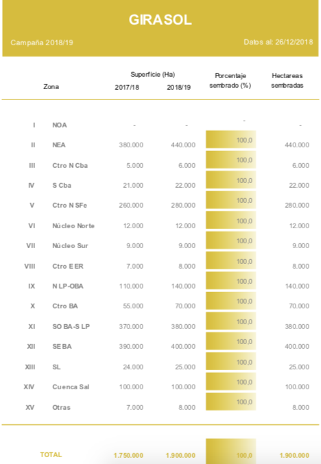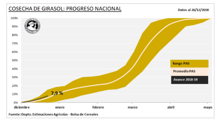Las labores de recolección de girasol continúan avanzando sobre las regiones del NEA y Centro- Norte de Santa Fe, ubicándose en el 7,9 % de la superficie apta. En números absolutos se cosecharon cerca de 150 mil hectáreas que arrojaron un rendimiento medio nacional de 20,6 qq/Ha. En paralelo, la oleaginosa implantada sobre las provincias de Buenos Aires y La Pampa transita etapas de botón floral y principios de floración bajo una condición de humedad que varía entre adecuada y regular.