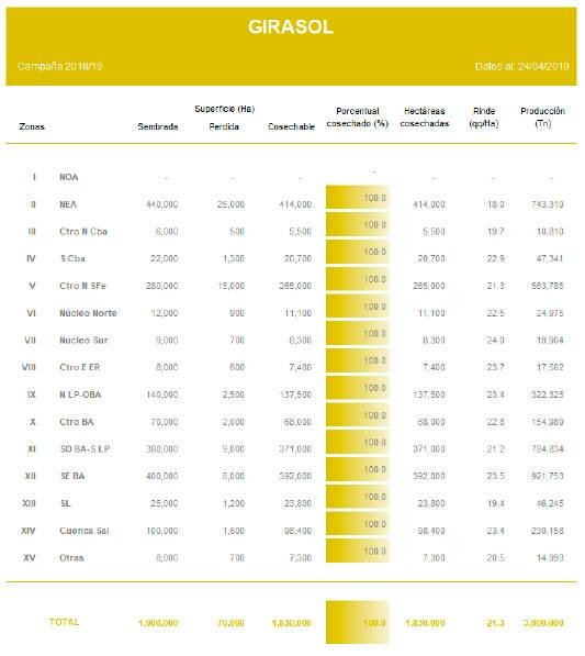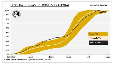 Con un avance intersemanal de 2,1 puntos porcentuales, culminó la cosecha a nivel nacional. Los rindes se mantuvieron en muy buenos niveles en el núcleo girasolero del sur del país. En cambio, hacia el norte de la región agrícola, los rindes culminaron por debajo de las expectativas iniciales. Fundamentalmente esta baja