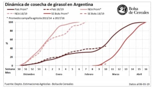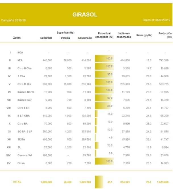 La cosecha de girasol se ubicó en el 45,1 % del área apta con un rinde medio nacional de 20,1 qq/Ha. La proyección de producción se mantiene en 3,9 MTn.