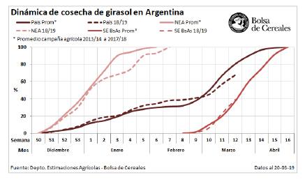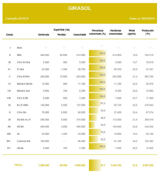 Buenas condiciones climáticas registradas durante los últimos días sobre los núcleos girasoleros de Buenos Aires y La Pampa permitieron avanzar con la cosecha de girasol. El progreso nacional alcanzó el 67,7 % de la superficie apta con un rendimiento medio que se ubicó en los 21 qq/Ha. En números absolutos se recolectaron más de 1,2 millones de hectáreas y se acumuló un volumen parcial que superó las 2,6 millones de toneladas. A pesar de haberse registrado una leve disminución en losrendimientos recolectados sobre los lotes tardíos implantados sobre el sur de Buenos Aires y La Pampa, la proyección de producción para la presente campaña se mantiene en 3.900.000 toneladas. De todas maneras, no se descarta la posibilidad de registrar modificaciones sobre la actual proyección en función de cómo evolucionen las labores de cosecha en los próximos días.