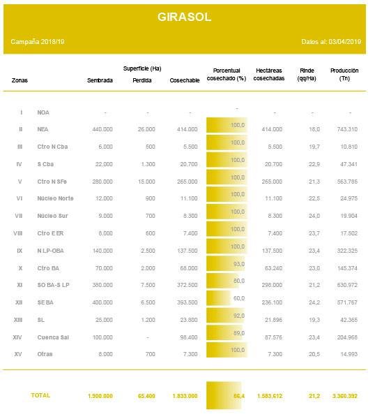 La recolección concentró su actividad sobre los núcleos girasoleros del sur bonaerense, en donde se encuentra más del 90 % de la superficie aún por cosechar. En paralelo, también se relevaron progresos menores en zonas que se encuentran culminando las labores como ser el Centro de Buenos Aires, la región Cuenca del Salado y también en San Luis.