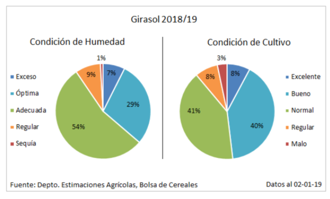 Las precipitaciones acumuladas durante la última semana mejoraron la condición de humedad en lotes de girasol que se encuentran transitando etapas reproductivas en Buenos Aires y La Pampa. En paralelo, la cosecha progresó sobre las regiones del NEA y Centro-Norte de Santa Fe, permitiendo recolectar el 14,5 % del área implantada a nivel nacional. El rinde medio se ubicó en 19,6 qq/Ha y se recolectaron más de 530.000 toneladas. Además, las expectativas de rendimiento relevadas sobre el sur del área agrícola mantienen la proyección de producción en 3.900.000 toneladas, cifra que se ubicaría un 11,4 % superior al ciclo previo (Producción Girasol 2017/18: 3,5 M Tn).