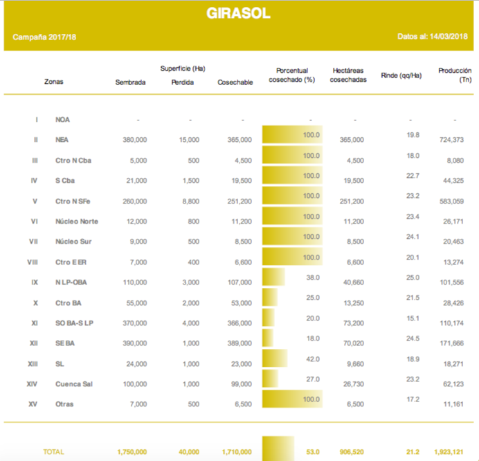 La cosecha de girasol se dio por finalizada en las regiones Sur de Córdoba, Núcleo Norte, Núcleo Sur, Centro-Este de Entre Ríos y Corrientes, aportando en conjunto una producción de 115.000 toneladas. En paralelo, las labores de recolección continúan avanzando sobre los núcleos productivos de Buenos Aires y La Pampa con rendimientos que presentan gran heterogeneidad. Por el momento, los rindes recolectados en el oeste y sudeste de Buenos Aires permiten mantener la proyección de producción en 3.600.000 toneladas, un 9 % superior al ciclo previo.