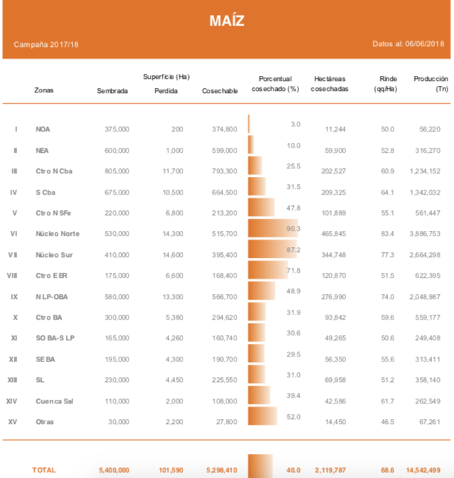 Durante la última semana la recolección de lotes de maíz con destino grano comercial comenzó a tomar impulso en las provincias de Córdoba, Buenos Aires, Santa Fe y Chaco. Las buenas condiciones del tiempo registradas en gran parte del área agrícola nacional permitieron recuperar piso en los lotes y de esta manera que se reiniciara la cosecha de cuadros tardíos y de segunda ocupación. En cuanto a los rendimientos que se vienen relevando la última semana, los mismos se mantienen por debajo de las expectativas iniciales. A la fecha se cosechó el 40 % de las 5,4 MHa sembradas la actual campaña, marcando un avance intersemanal de 3,1 puntos porcentuales. En números absolutos se han recolectado más de 2,1 MHa, con un rendimiento medio nacional que descendió hasta los 68,6 qq/Ha.